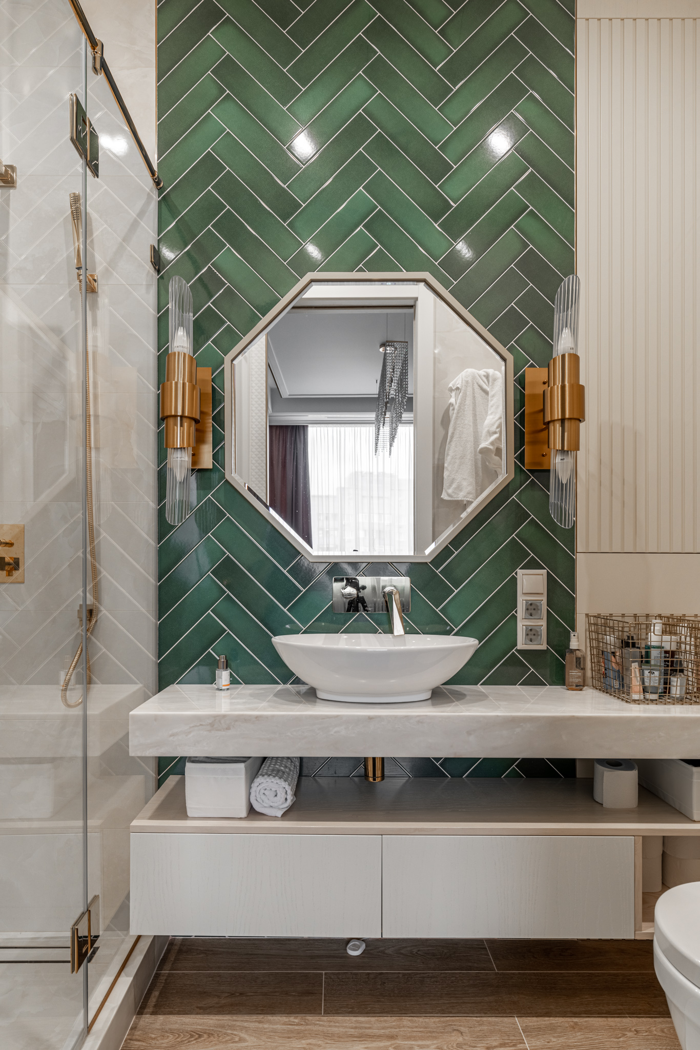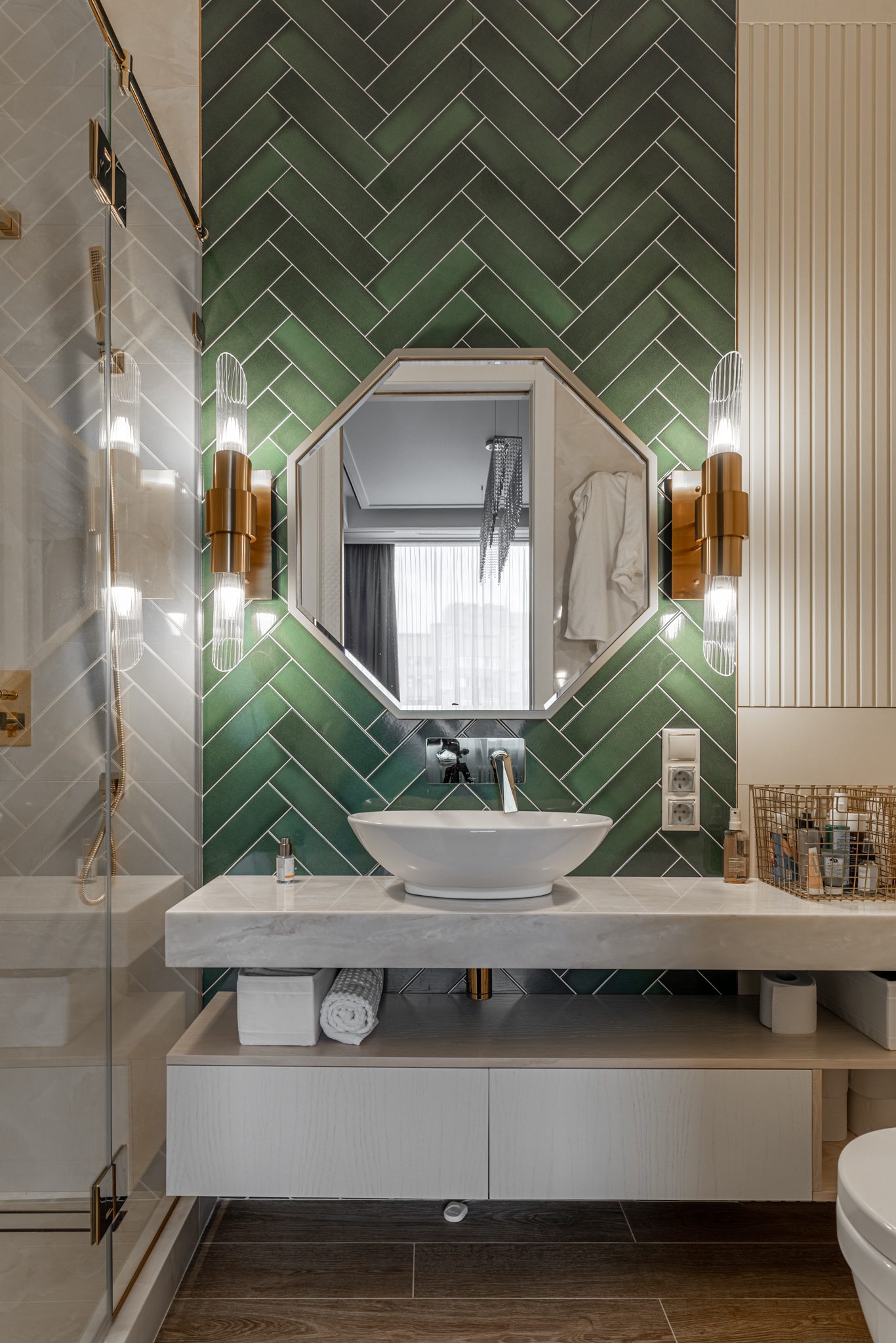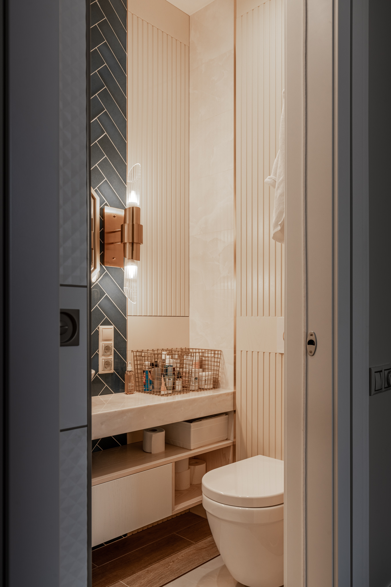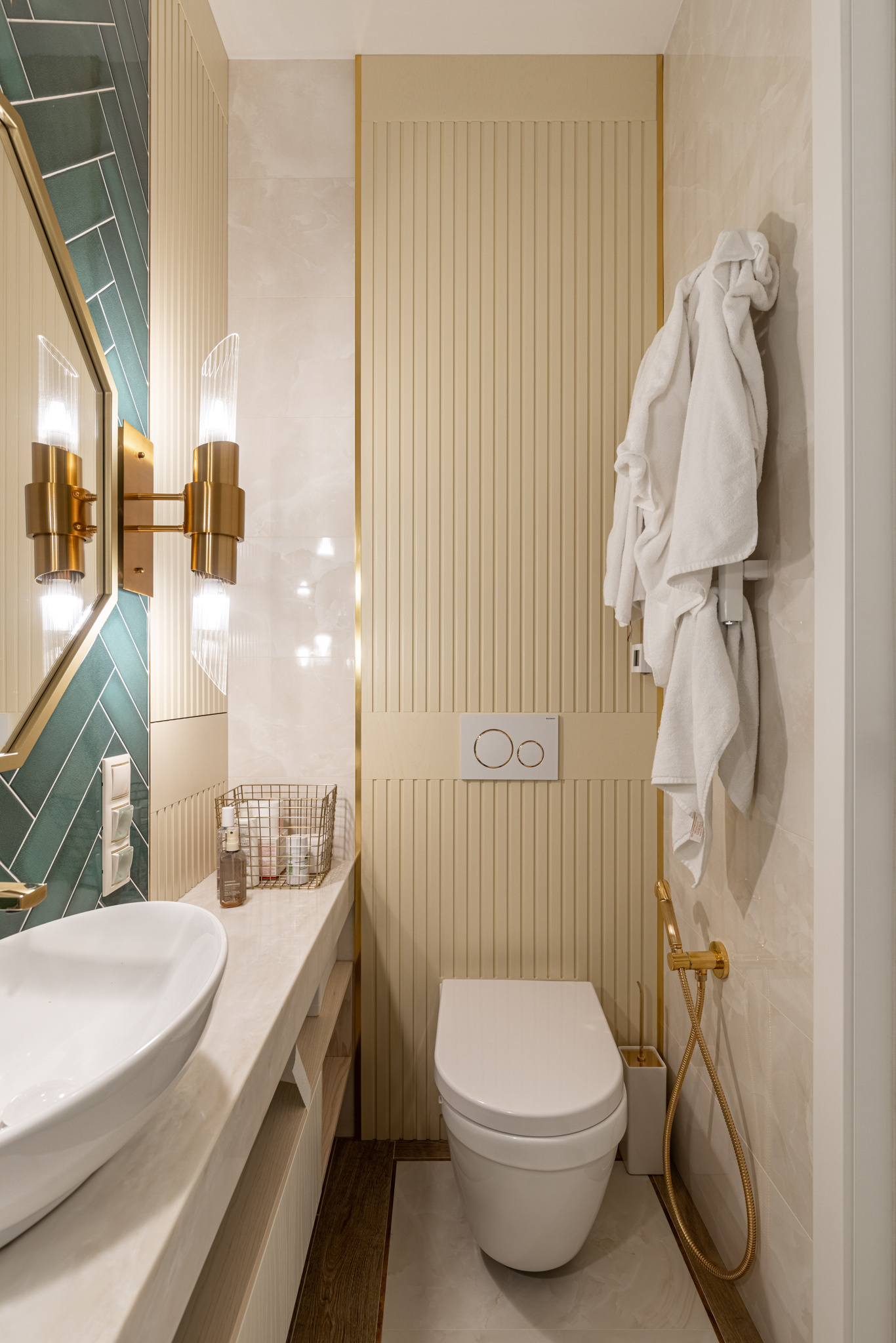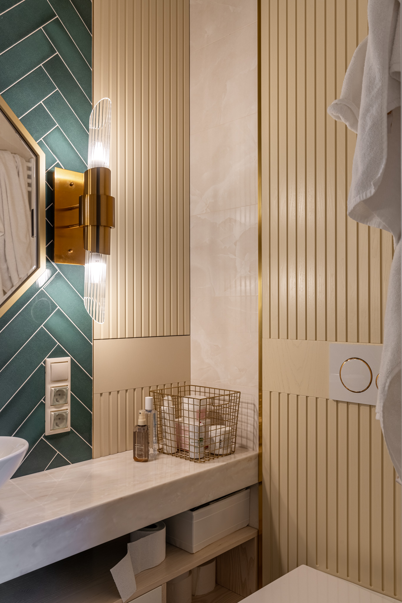 Мебель в ванную комнату из шпона, тонированного морилкой, и фрезерованными фасадами. Посмотреть весь реализованный проект