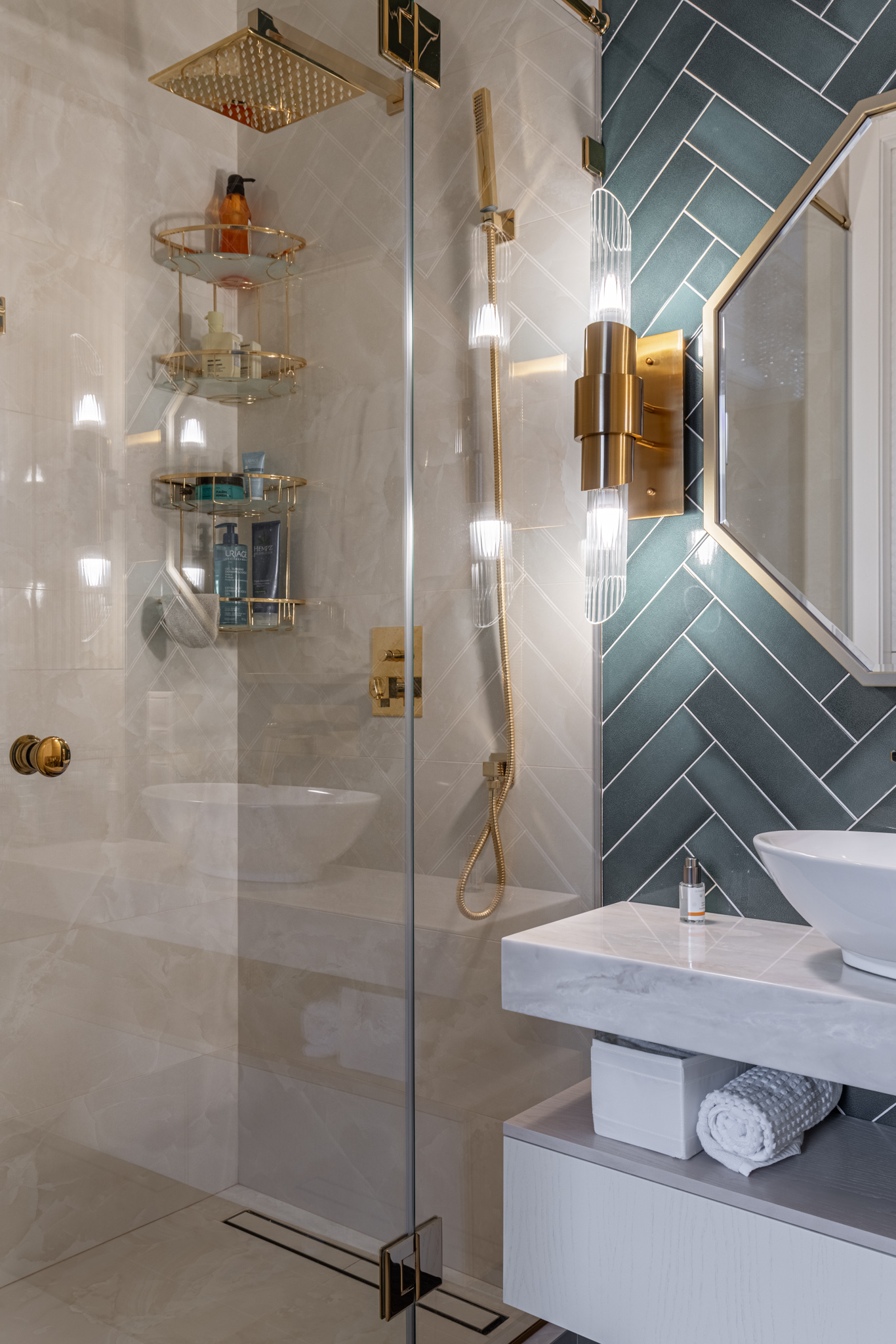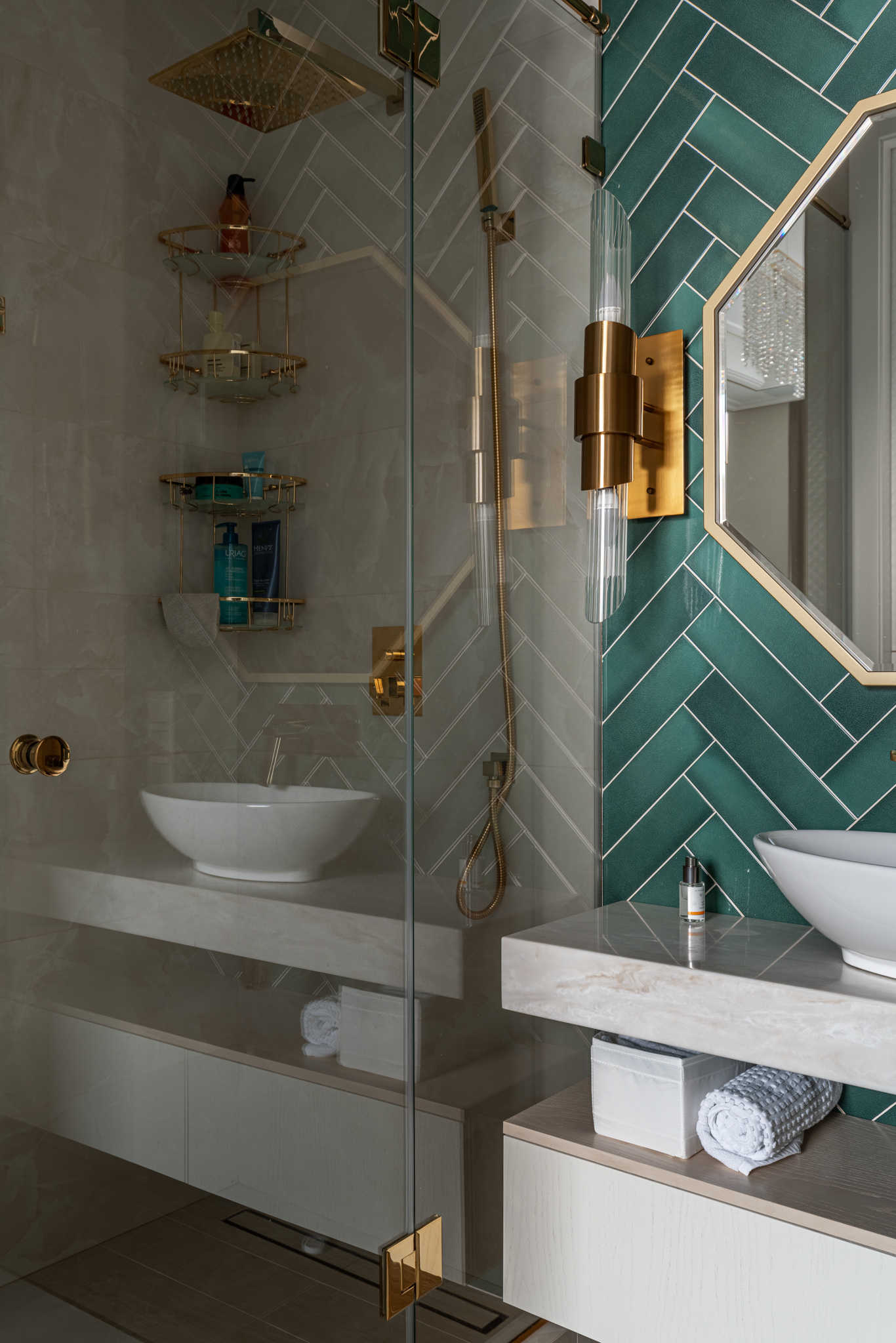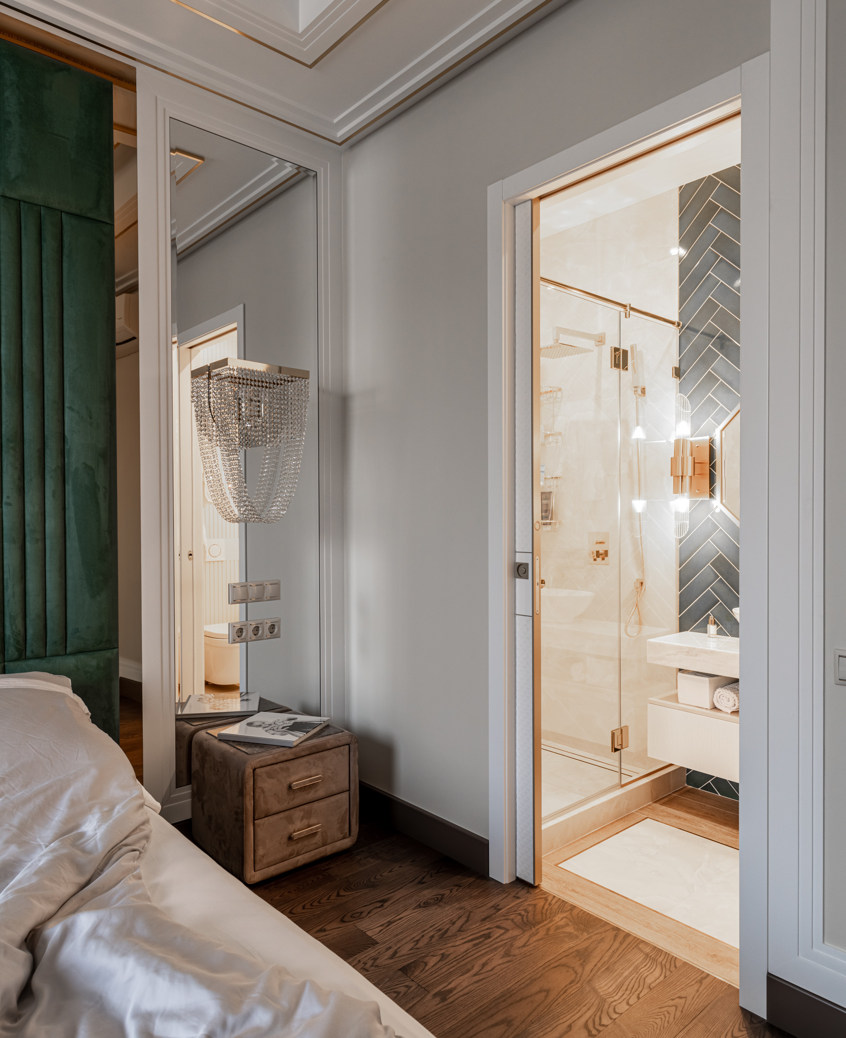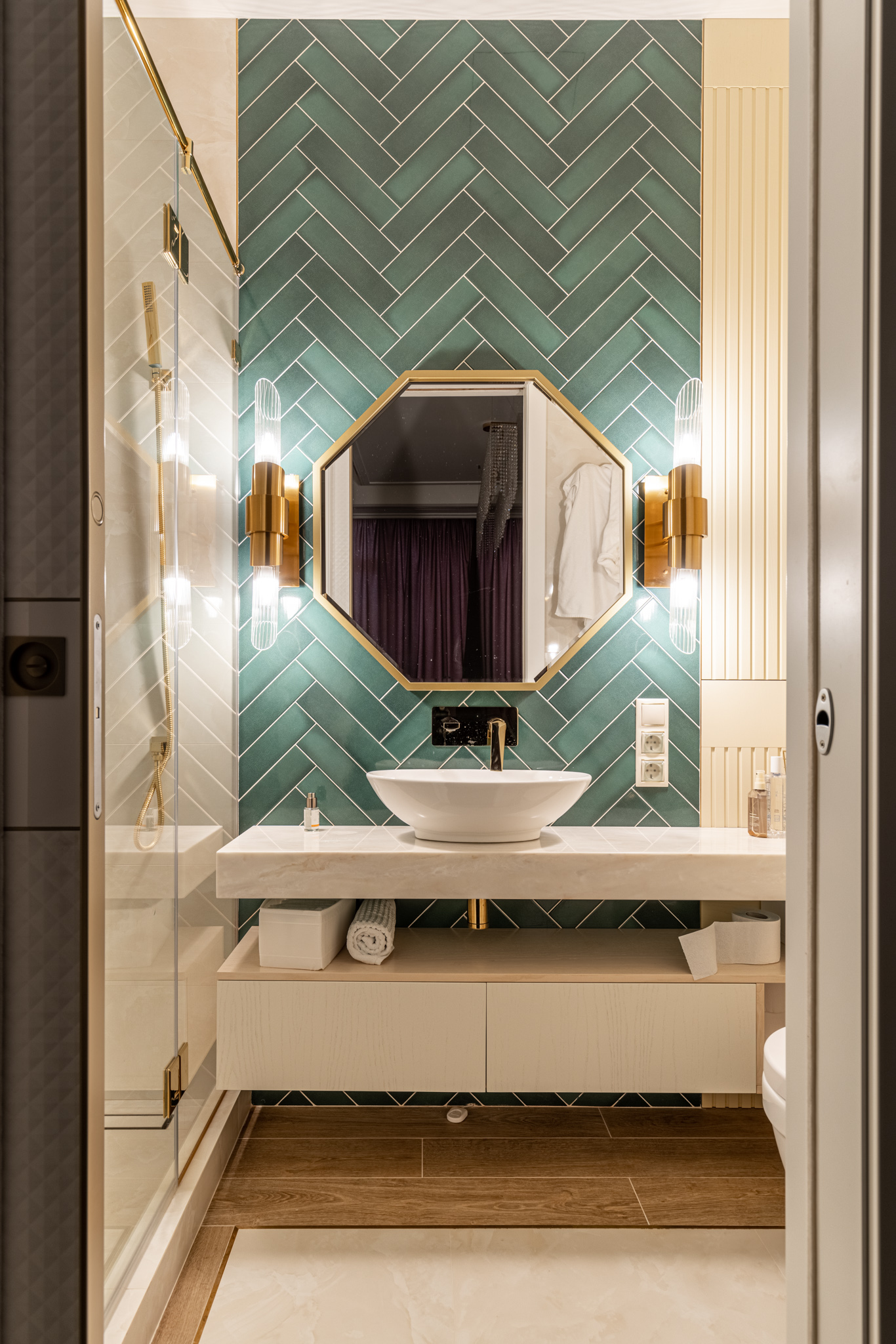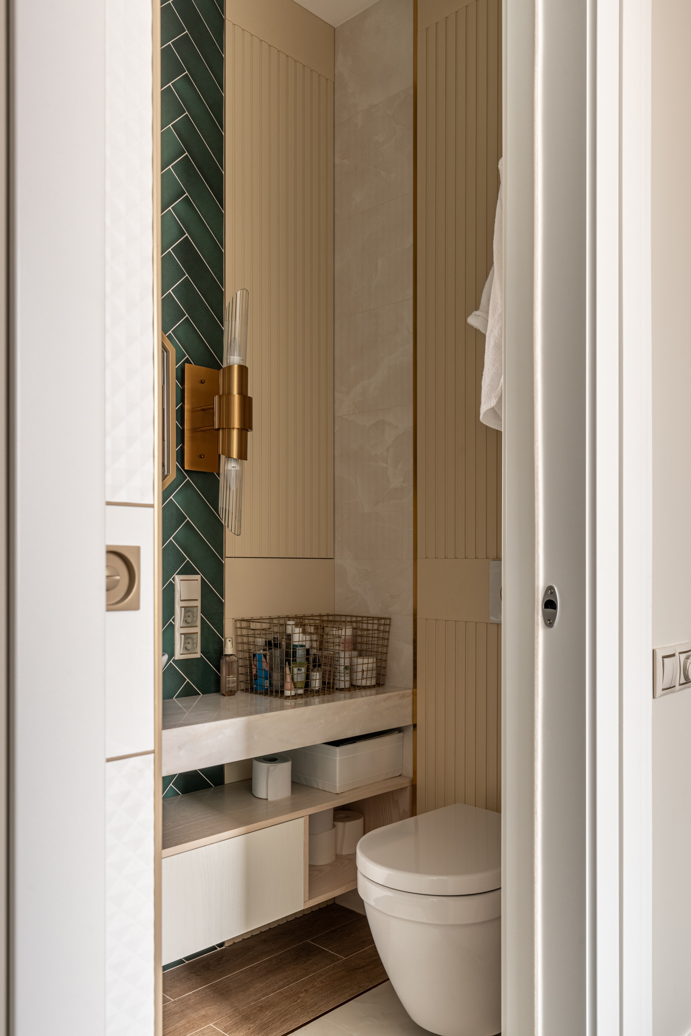 Мебель в ванную комнату из шпона, тонированного морилкой, и фрезерованными фасадами. Посмотреть весь реализованный проект